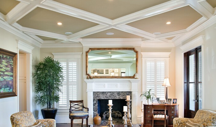 井格式吊頂是利用井字梁因形利導或為了頂面的造型所制作的假格梁的一種吊頂形式。配合燈具以及單層或多種裝飾線條進行裝飾,豐富天花的造型或?qū)邮疫M行合理分區(qū)。