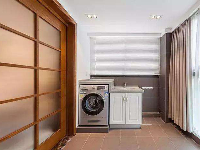 大多數(shù)家庭都會把洗衣機放陽臺,單單放一個洗衣機在陽臺角落,或許有人會覺得占位置不實用,那不妨加裝一個陽臺洗衣機柜,既能放洗衣機,又能擠出一些收納空間,一舉兩得。如下圖: