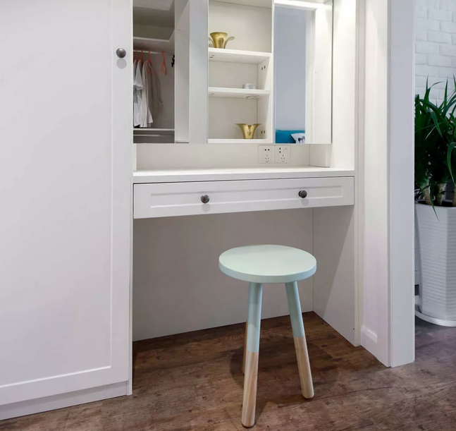 利用主臥富裕的面積加出來(lái)的衣帽間兼梳妝區(qū),有單獨(dú)的燈光照亮梳妝區(qū)。請(qǐng)不要問(wèn)我梳妝臺(tái)的鏡柜門(mén)正好中間那塊沒(méi)有怎么照,其實(shí)那塊壞了拿去維修了……