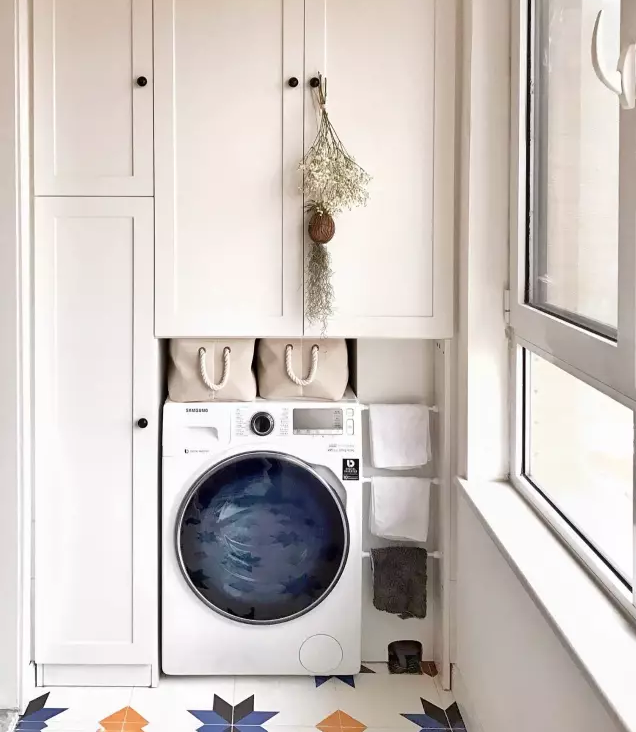 衛(wèi)生間面積不夠,或者覺得陽臺(tái)放洗衣機(jī)比較方便的小伙伴 ,也可以考慮把洗衣機(jī)放陽臺(tái),這樣洗完直接晾曬。