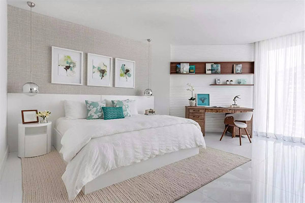無(wú)論房間大小,家具的數(shù)量都要適量,這樣臥室的整體觀感會(huì)很明亮寬暢。同時(shí)墻面也可以做做文章,讓你的臥室更有內(nèi)涵。