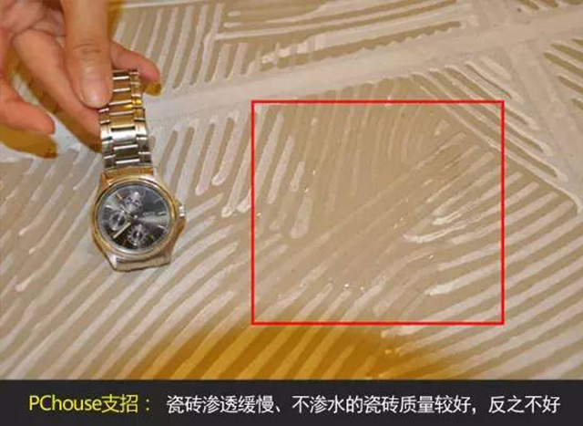 看瓷磚吸水率。一般來(lái)說(shuō),瓷磚的吸水率低,代表瓷磚的內(nèi)在穩(wěn)定性越高,也就越適合濕氣或水分含量較高的空間,如衛(wèi)生間、廚房等,且不會(huì)產(chǎn)生黑斑等問(wèn)題。檢驗(yàn)瓷磚吸水率的常用方法是將瓷磚的背面倒水,滲透緩慢甚至不滲水的瓷磚質(zhì)量較好,反之則為不好。