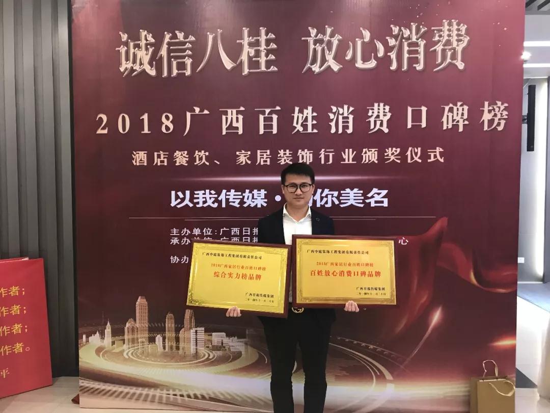 在2018廣西百姓消費(fèi)口碑榜中,中庭裝飾集團(tuán)榮獲百姓放心消費(fèi)口碑品牌獎(jiǎng)綜合實(shí)力榜品牌獎(jiǎng)”,由南國(guó)早報(bào)副總編輯趙永勝南國(guó)早報(bào)副總編輯鄧志勇為其頒獎(jiǎng)。