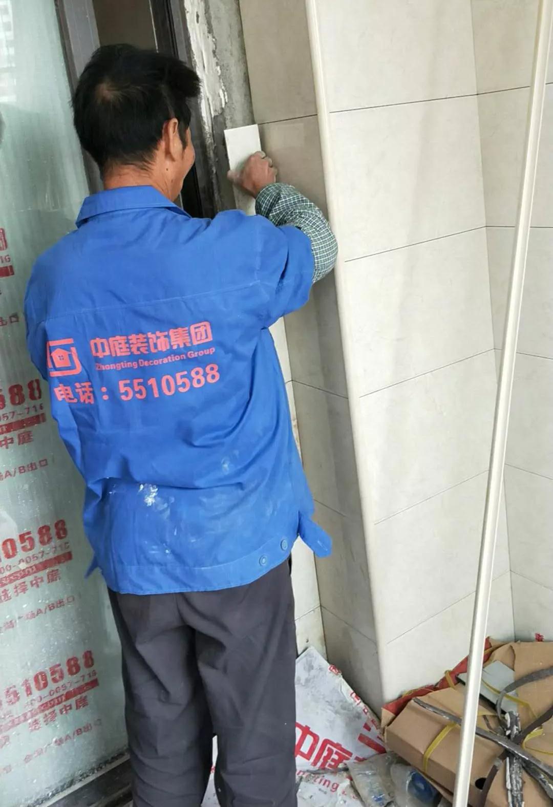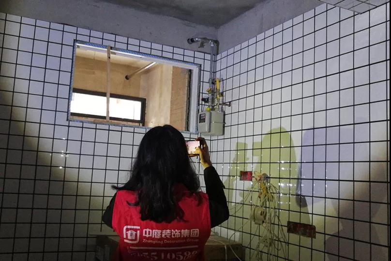 現(xiàn)場檢查是否按圖施工,檢查墻面鋪磚平整度
