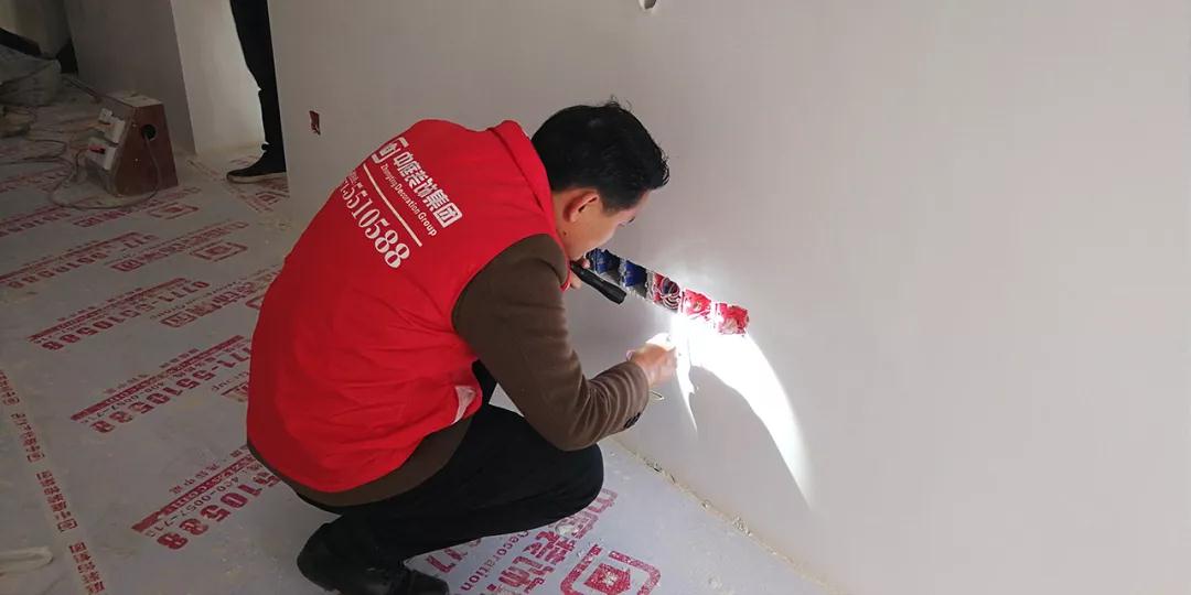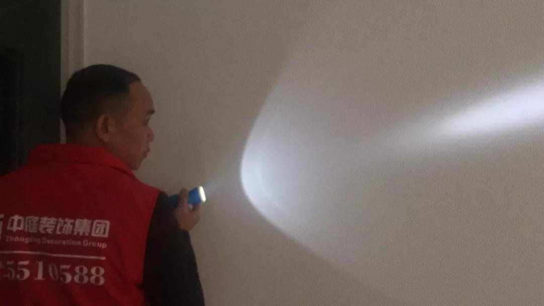 集團(tuán)工程質(zhì)量管理中心總監(jiān)吳總用強(qiáng)光手電筒檢查刮膩?zhàn)悠秸?/span>