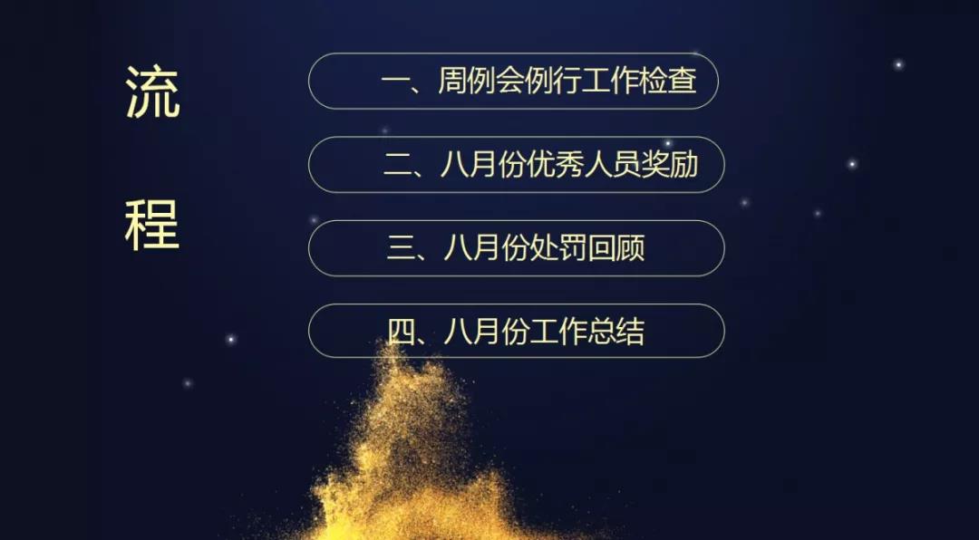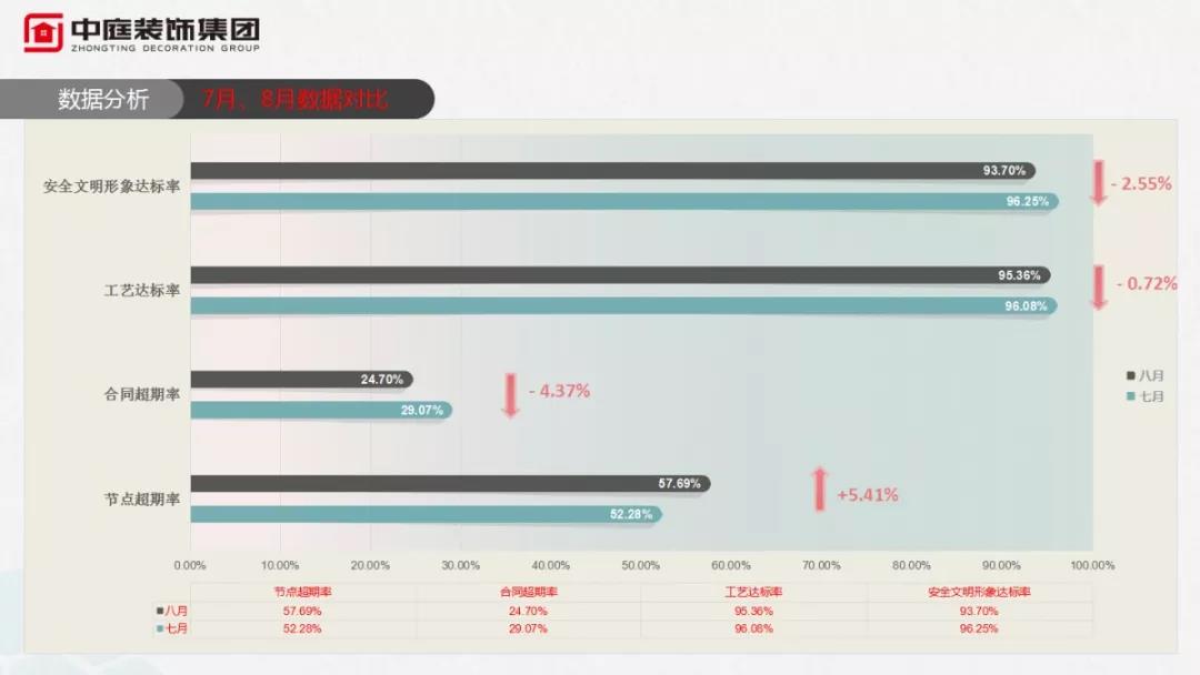 在總結(jié)8月份工作上,項目經(jīng)理個人月度達標率和客服回訪業(yè)主評分成為衡量他們月度工作的指標,每到這個環(huán)節(jié),大家的心都懸到了喉嚨眼,但凡工藝達標率和安全文明形象達標率沒有達到90%及以上的,都要上臺面向所有人承諾,下月勢必做好工地管理,雙向達標,否則按制度處罰!