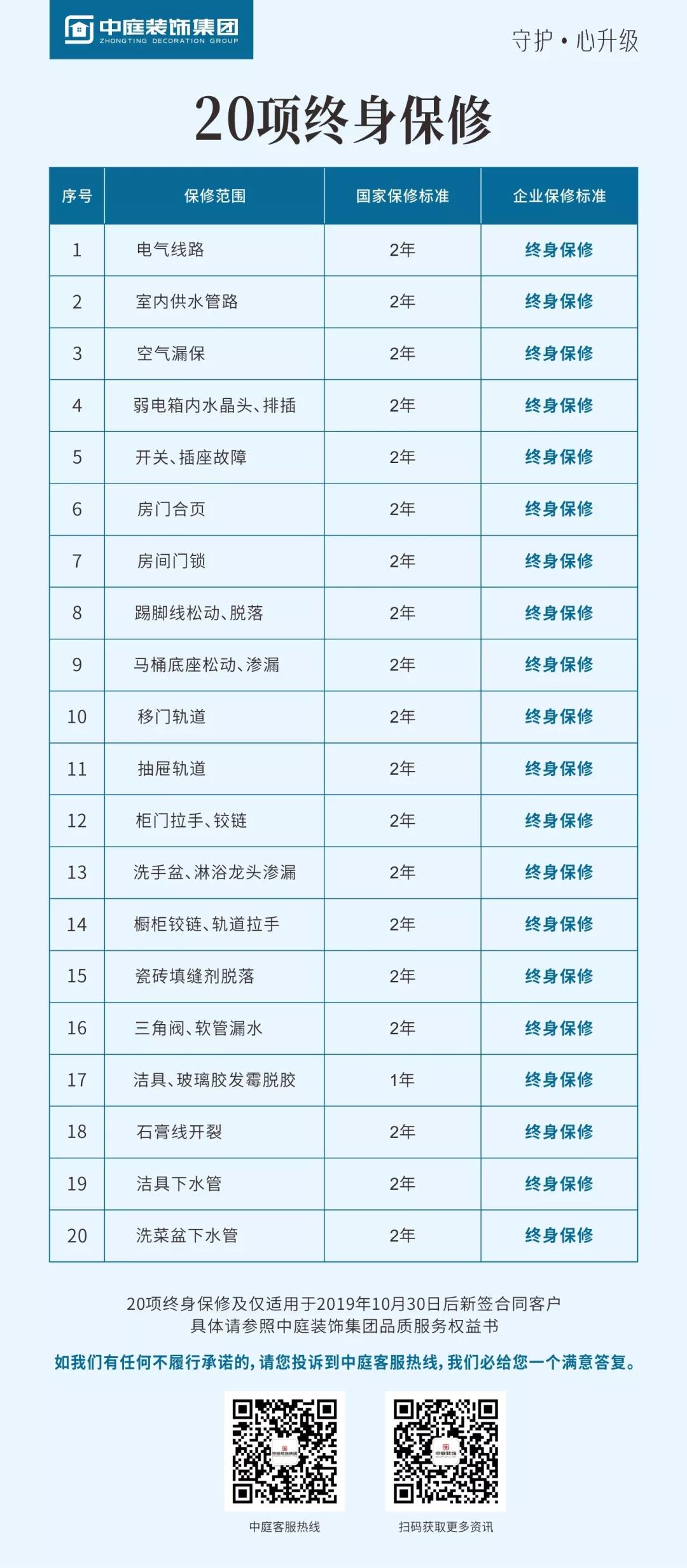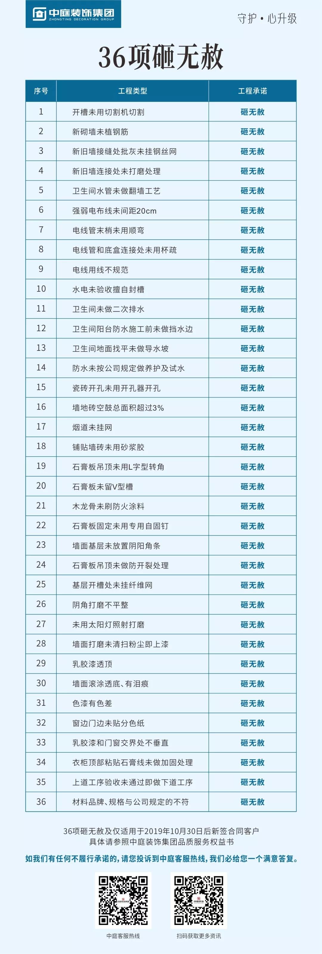 集團率先在廣西在家裝行業(yè)提出20項客戶最為關注的終身保修,以及36項砸無赦項目承諾,對于不達標的施工施行“零容忍”,以更嚴格的施工標準為品質(zhì)家保駕護航。