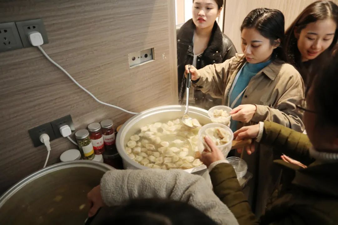 茶水間里煮著餃子湯圓熱氣騰騰,溫暖了寒冬里一顆顆思念故鄉(xiāng)的心。