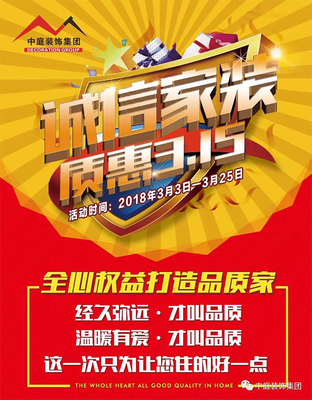 誠(chéng)信家裝,品質(zhì)宣言,我宣誓:誠(chéng)信中庭人,從我做起,我愿意遵守公司誠(chéng)信承諾,以客戶滿意為第一原則,讓百萬(wàn)家庭享受快樂(lè)裝修。誠(chéng)信315,在消費(fèi)陽(yáng)光下,中庭裝飾集團(tuán)向您鄭重承諾: