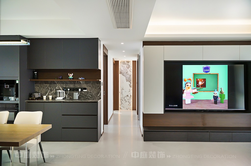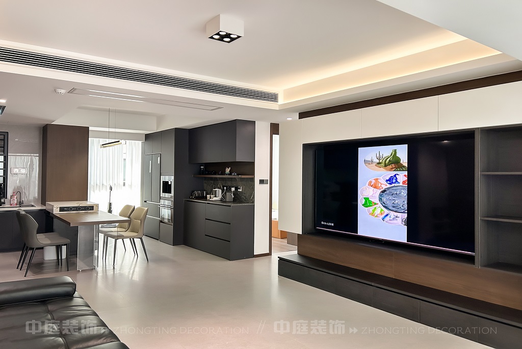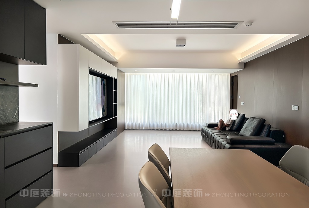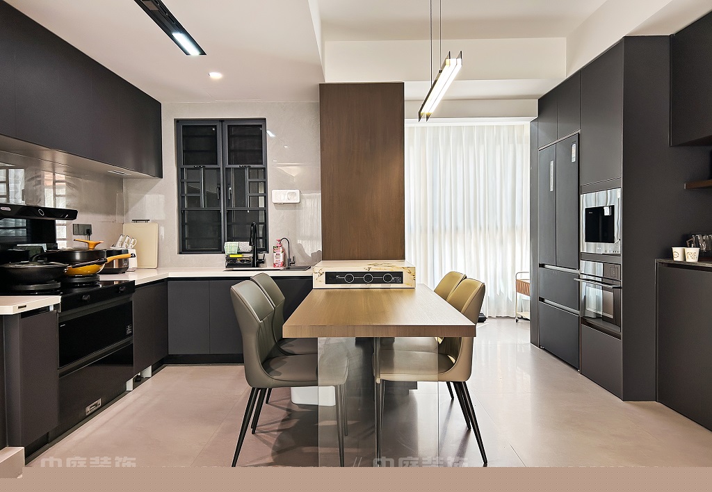 瀏覽量:45客廳以現(xiàn)代黑白灰極簡風(fēng)格為核心,大面積白紗簾引入自然光線,黑色皮質(zhì)沙發(fā)質(zhì)感高級(jí)。開放式布局,深灰櫥柜與木質(zhì)餐桌形成材質(zhì)對(duì)比,線性吊燈提升精致感,功能與美學(xué)兼具,營造現(xiàn)代簡約的烹飪用餐氛圍。輕柔窗簾與柔和燈光,打造靜謐休息空間。精致的材質(zhì)選擇與合理的功能規(guī)劃,詮釋了“少即是多”的現(xiàn)代簡約居住美學(xué)。