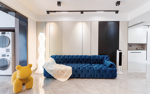 使用更親近自然的棉、麻、木搭配黑、棕、白、灰色,在裝飾上極度的克制,給人高品質(zhì),舒服的感受。削弱復(fù)雜造型和色彩對人情緒的影響,反而產(chǎn)生了治愈的力量??巳R因藍(lán)沙發(fā)的點睛之筆,顯得整個空間更加自信,給人傳遞高級的視覺感受。